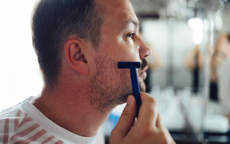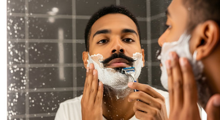 A young man dedicates time to his grooming routine in a bathroom. Soft light creates a dramatic effect on his face as he shaves, reflecting personal care.