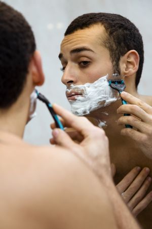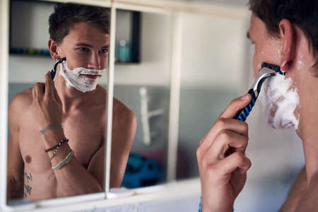 Good morning handsome. Shot of a young man shaving his beard while looking at himself in the mirror.