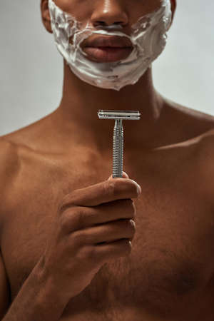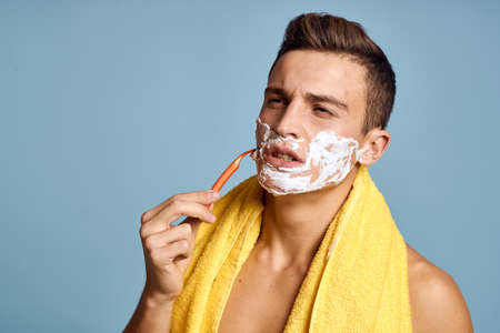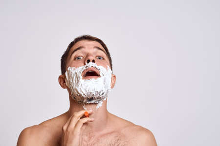 Handsome man with white shaving foam on his face and clean skin with razor grooming bare shoulders