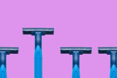 Beauty and fashion pop art concept. Many colored plastic razors on blue background. Minimalism