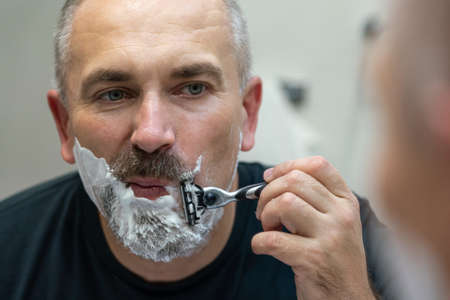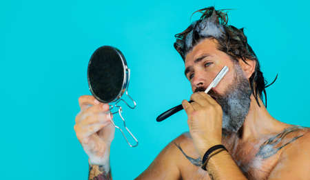 Bearded man shave with razor looking in mirror. Beard care. Portrait of shaving man. Barbershop.