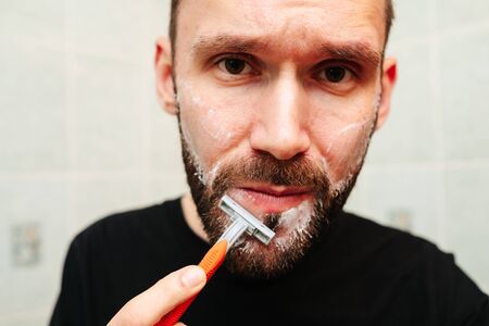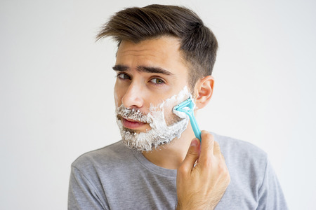 portrait of young caucasian man shaving in amazement looking at sharp razor in his hand