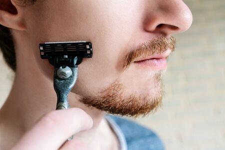 A man shaves a shaving machine without using foam, soap and cream. Close up