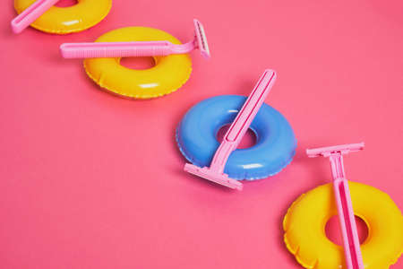 pink disposable razors on small toy balloons on pink background, body hair removal before beach vacation concept, summer vacation and depilation