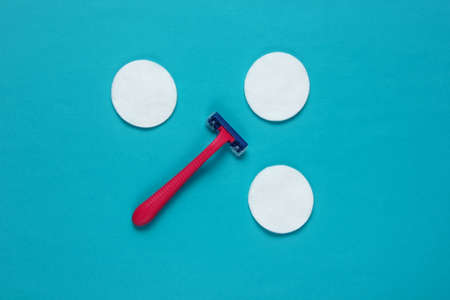 Beauty still life, minimalism. Plastic epilator razor with cotton circles on blue background. Women's accessories for beauty care. Top view