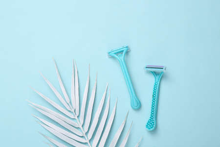 Disposable razors for depilation on blue background with white palm leaves. top view