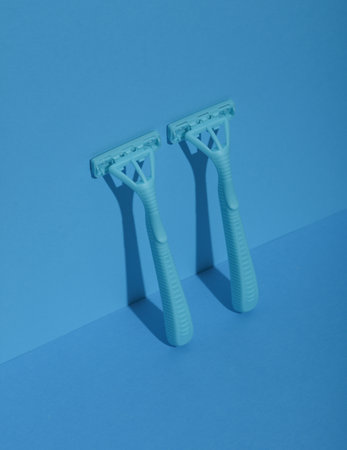 Blue disposable razors on blue background. Creative layout. Minimalism