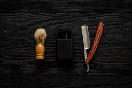 Barber s tools brush razor with wooden handle dark background