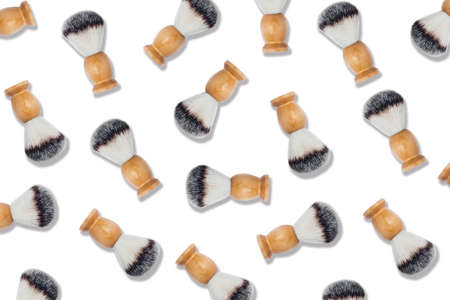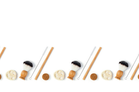 Zero waste pattern. Natural shaving brushes on isolated white background. Flat lay, top view.