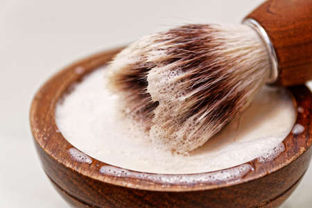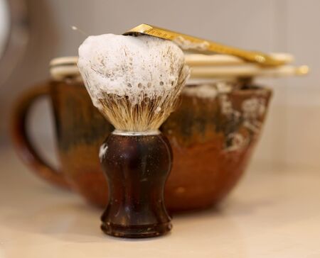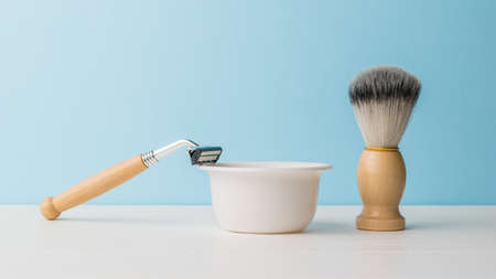 A razor and a brush with wooden handles and a foam bowl on a white table. Men's accessories for appearance care.