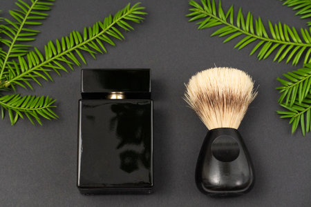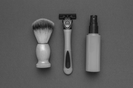 A black and white image of a razor, shaving brush and lotion on a gray background. The concept of facial hygiene.