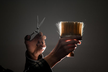 Close-up on vintage talcum brush and scissors in male hands.