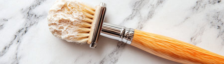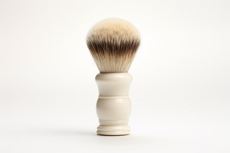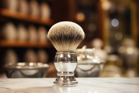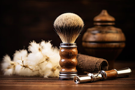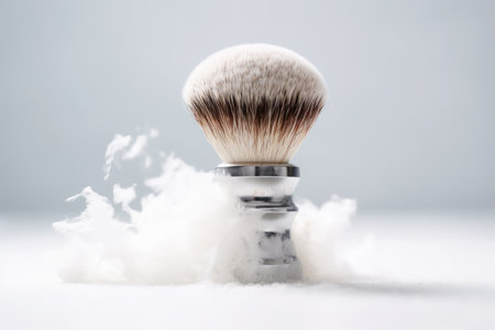 A close-up captures a shaving brush, featuring a metallic handle and a dense, light-colored bristle head. The composition highlights textures and materials against a dark background, showcasing its design. This image is suitable for various commercial uses, including product presentations and lifestyle content.