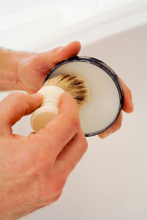 Hand with wooden shaving brush.