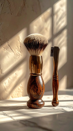 Shaving brush and shaving brush on the table in the sunlight.