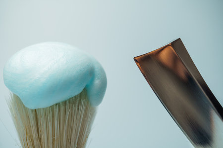 Shaving brush with light blue foam and metal razor blade ready for skincare routine
