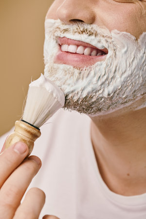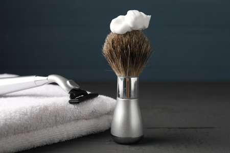 Selective focus on a concrete backdrop with shaving foam and brush representing male self care