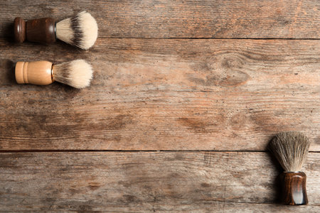 Flat lay composition with men's shaving brushes and space for text on wooden background