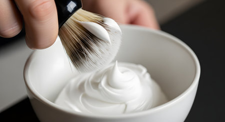 A close-up macro shot of a hand dipping a shaving brush into a white bowl filled with thick, whipped shaving cream. This evokes traditional wet shaving, grooming, and men's skincare.