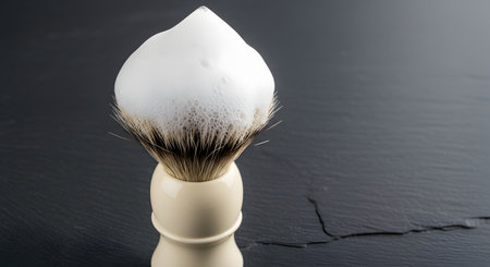 A classic men's shaving brush with a cream-colored handle stands on a dark, textured slate surface. The bristles are topped with a perfect, rich peak of white shaving foam, representing traditional wet shaving and grooming.
