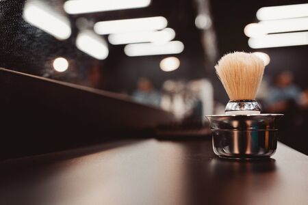 brush for shaving beard along with bowl, blurred background of hair salon for men, barber shop