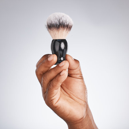Hand, brush and shaving with beauty and black man, hygiene and grooming with skincare mockup. Shave, body hair care and cosmetic tools marketing with barber equipment against studio background