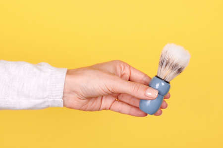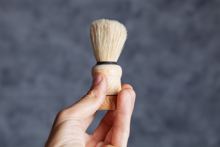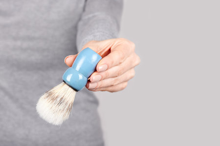 shaving brush in hand on gray background