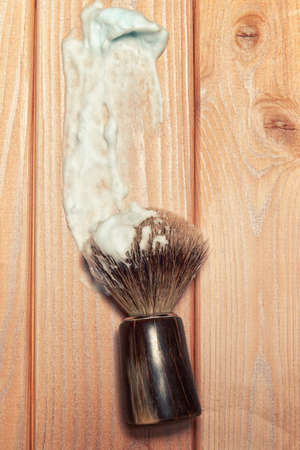 Luxury wooden background with shaving brush and soap