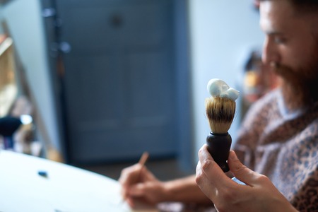 Shaving brush in the hands of man. Barter cleans the shaving tool.