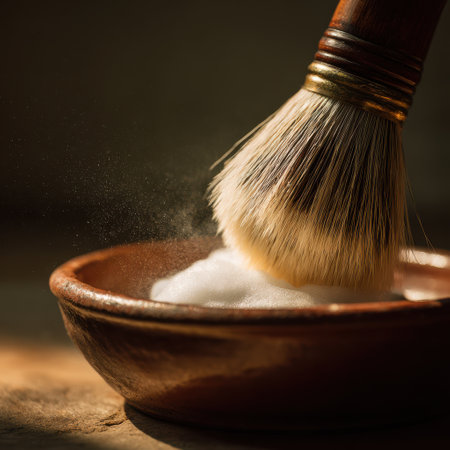 A close-up view captures a shaving brush swirling in a ceramic bowl, creating rich, creamy lather under soft, warm lighting. The scene evokes a sense of calm and attention to detail.
