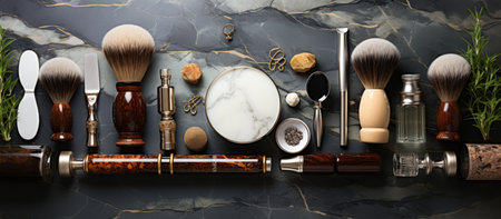 Set of barber tools for shaving and cosmetic beauty products for men.