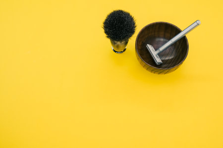 A high angle shot of a wooden shaving water bowl near a shaving brush and a razor isolated on a yellow background