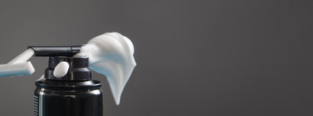 Shaving foam, razor and a green leaf on a gray background. The concept of facial hygiene.