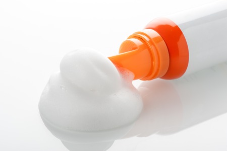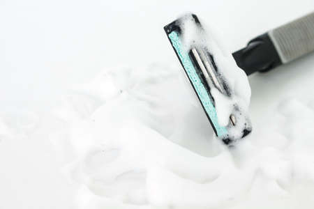 White shaving foam and razor on white background. Cosmetic for men. Studio closeup shot.