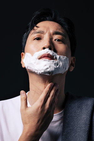 Closeup of a young man preparing to shave, he puts foam on his cheek