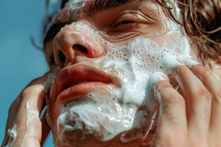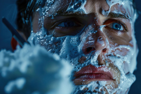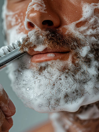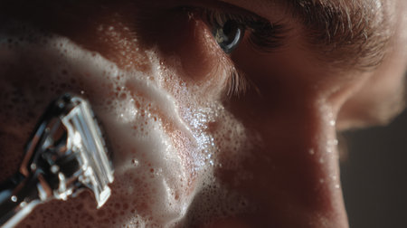 a man young in shaving foam, preparing to remove hair, part of a face close-up