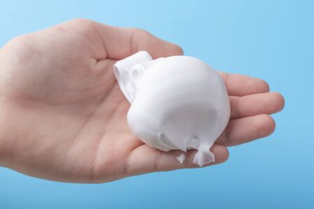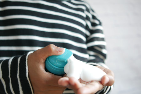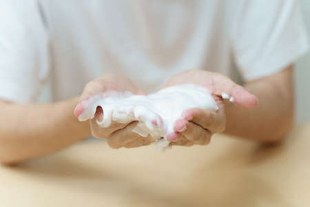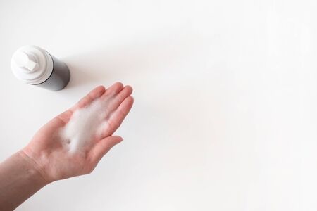Soft foam facial or hand cleanser in hand on white background and copy space. Daily skincare routine. Hygiene and healthcare, top view