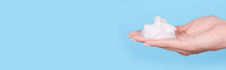 Hand with white bubble foam, isolated on blue background, copy space template, banner.