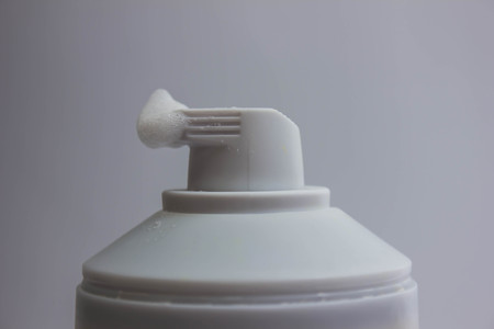 Shaving foam bottle in hands close-up on a white background, isolated. Mockup, layout