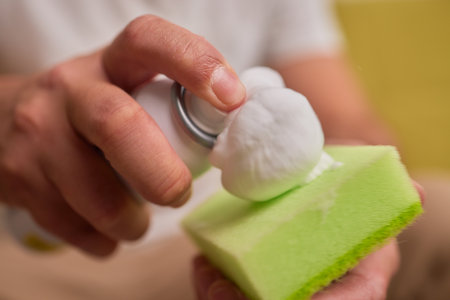 Close-up of man applying foam cleaner on white sneakers in basin, detailing shoe cleaning technique and maintenance for pristine footwear condition. Concept of shoe care and maintenance practices