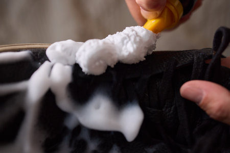 Detailed closeup image showing hands applying shoe cleaner to a brush for precise cleaning purposes
