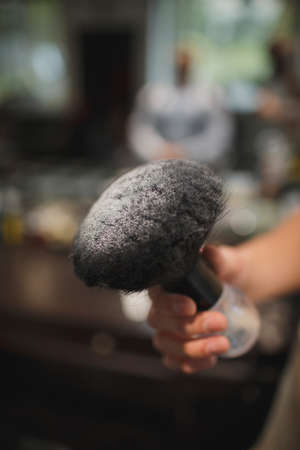 A close-up of a shaving accessory on a blurred background. A black brush in white talcum powder. Tools for cutting beard.