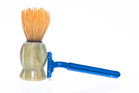 shaving brush and razor on a white