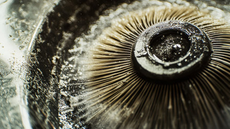 This close-up image shows a metallic brush on a reflective surface, featuring intricate bristle textures and water droplets, emphasizing a clean and polished look.