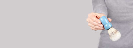 shaving brush in hand on gray background