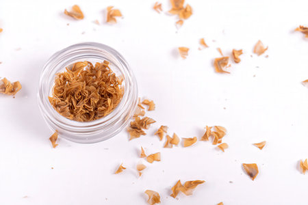 Tuna shaving katsuobushi, bonito flakes, ingredient of japanese soup dashi. Isolated on white background, copy space