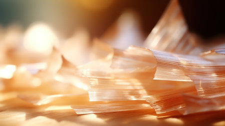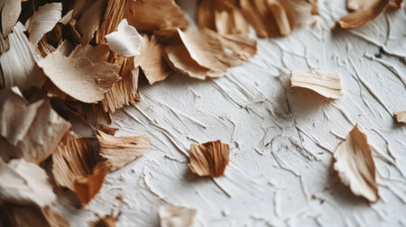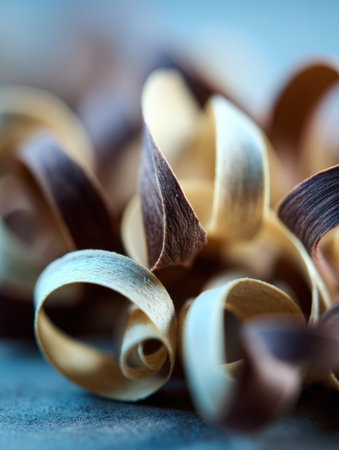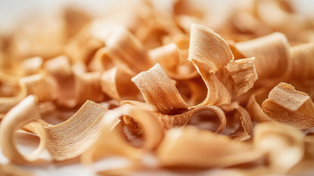 Beautiful spiral curled wooden sawdust in texture detail. Abstract close-up of wood shavings scattered on pile as decorative background. By-product of milling, routing or drilling. Woodworking waste.