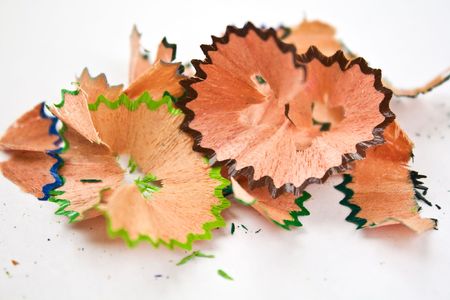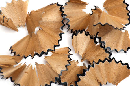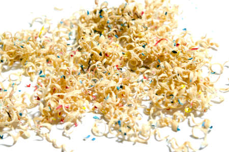 Pencil shavings. Wooden pencil shavings on white. sharpening debris. wooden waste