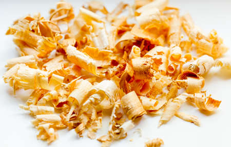 Wood chips isolated on light background. wooden shavings. The concept of woodworking and carpentry.