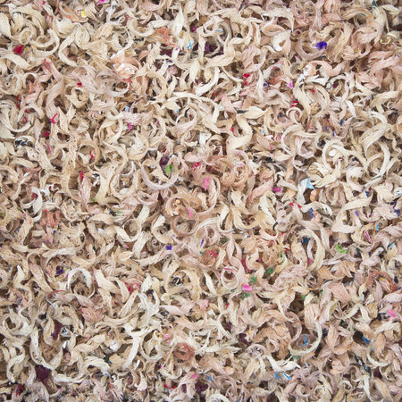 Wooden colored pencil sharpening shavings isolated on white background, top view.